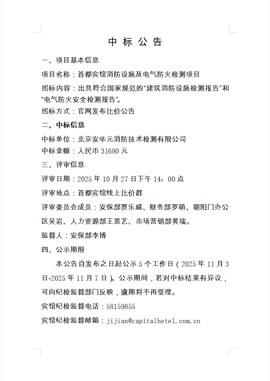 首都宾馆消防设施及电气防火检测项目中标公告