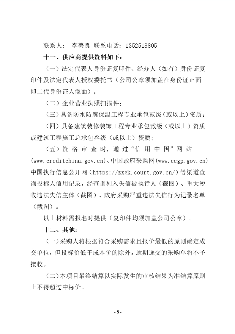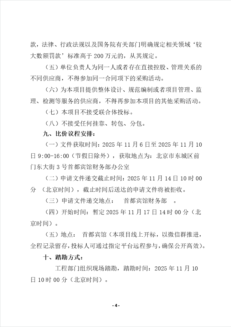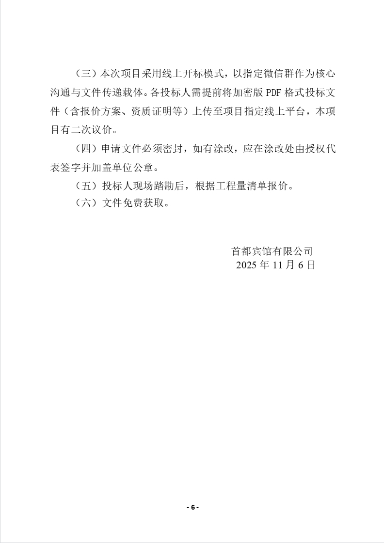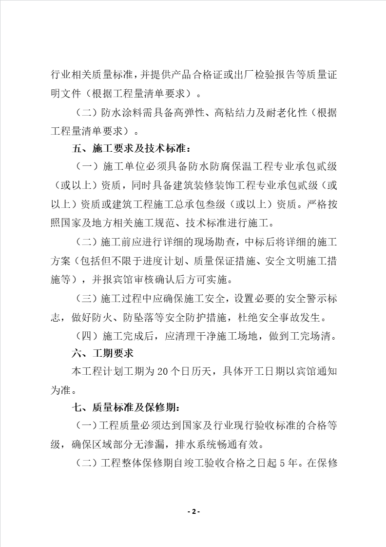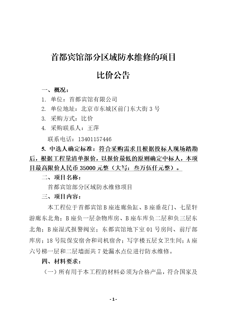 首都宾馆部分区域防水维修的项目比价公告