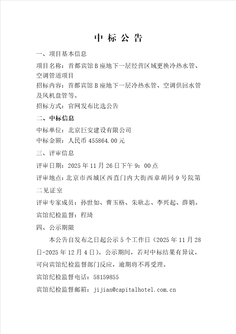 首都宾馆B座地下一层经营区域更换冷热水管、空调管道项目中标公告