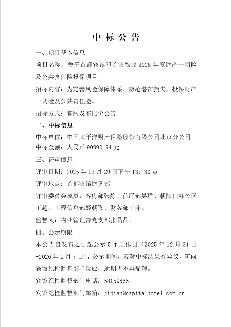 首都宾馆和首宾物业2026年度财产一切险及公共责任险投保项目中标公告