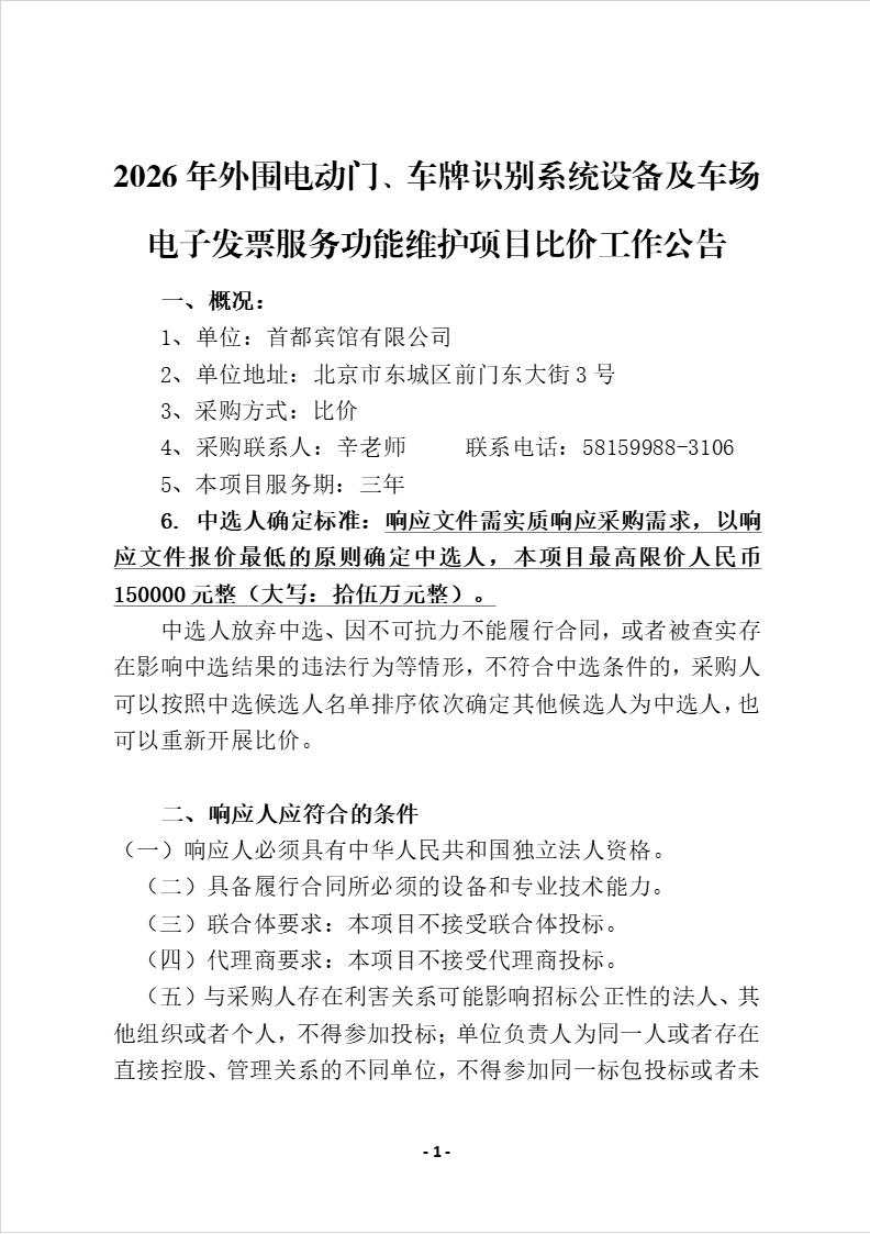 2026年外围电动门、车牌识别系统设备及车场电子发票服务功能维护项目比价工作公告