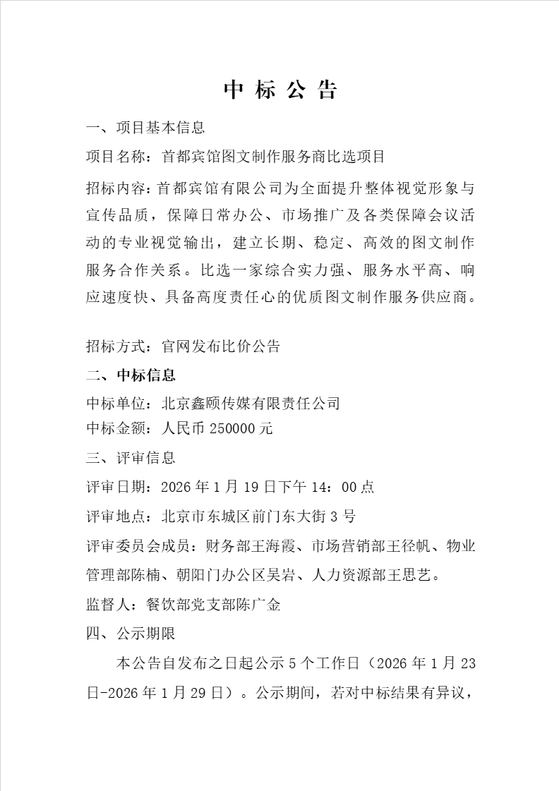 首都宾馆图文制作服务商比选项目中标公告