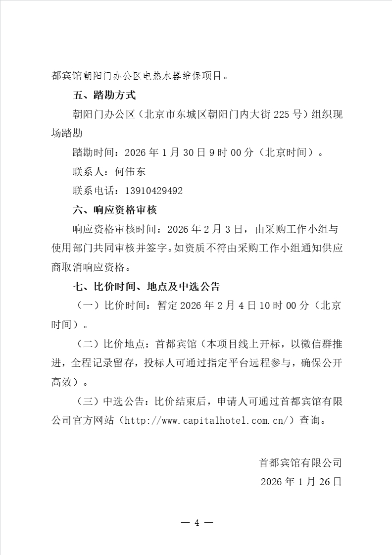 首都宾馆朝阳门办公区电开水器维保项目比价公告