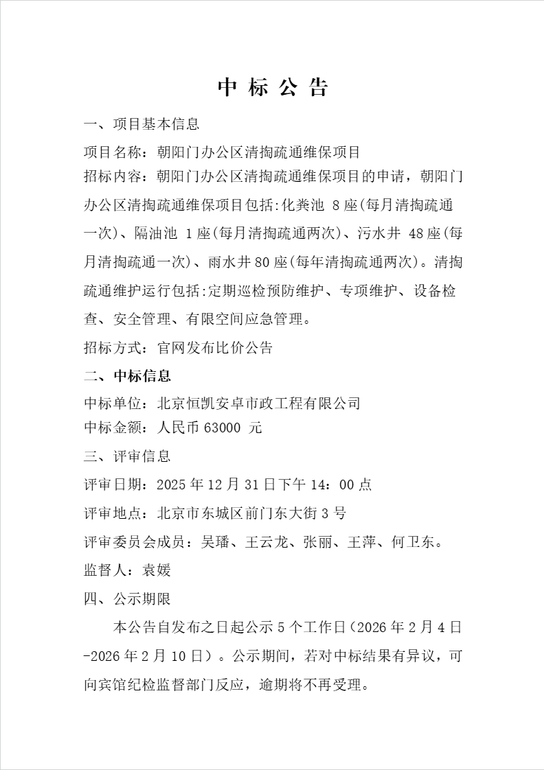 朝阳门办公区清掏疏通维保项目中标公告