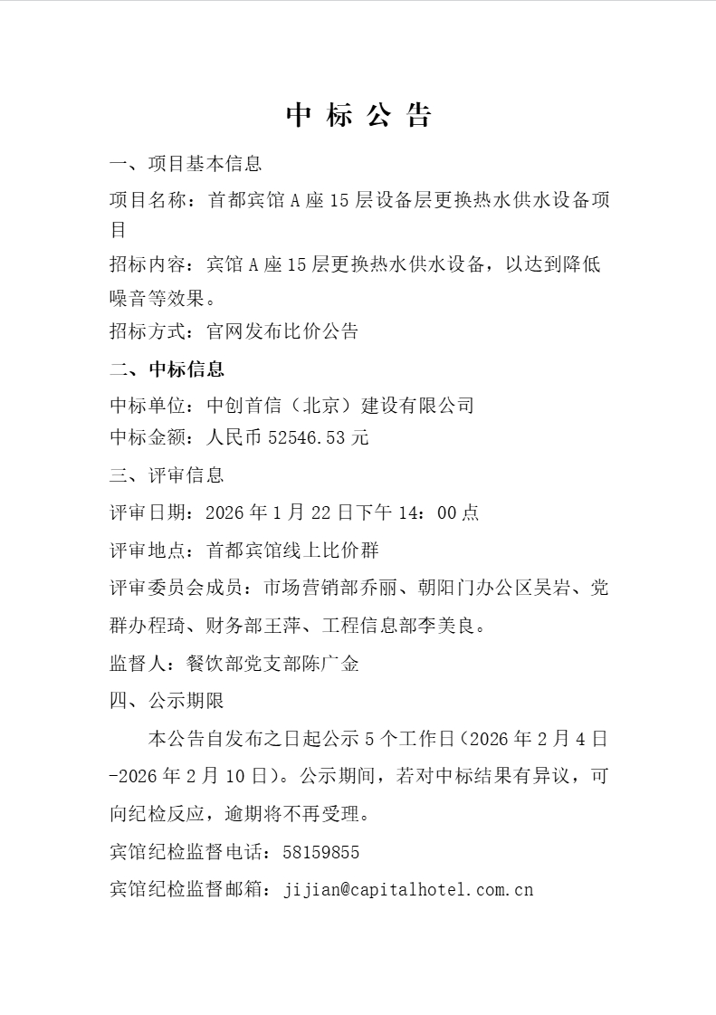 首都宾馆A座15层设备层更换热水供水设备项目中标公告