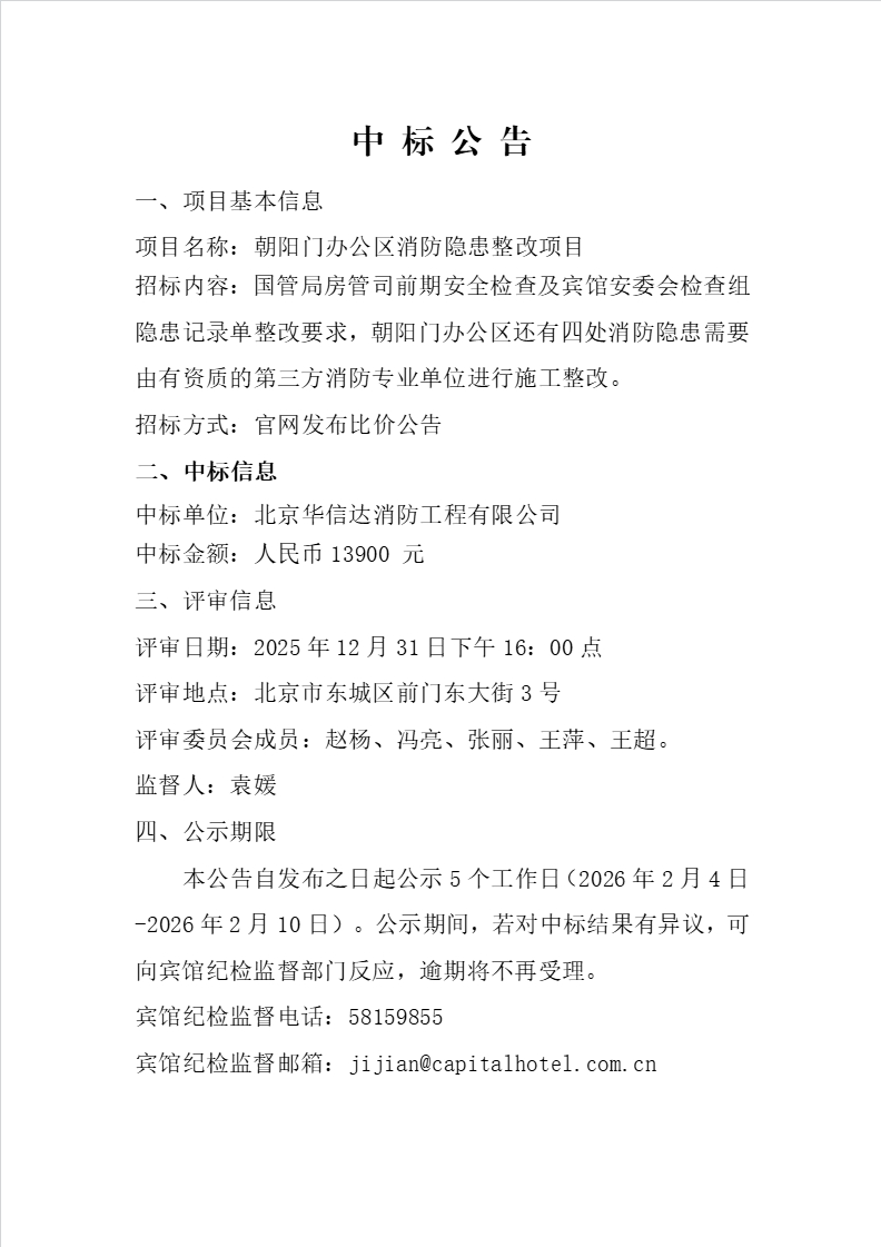 朝阳门办公区消防隐患整改项目中标公告