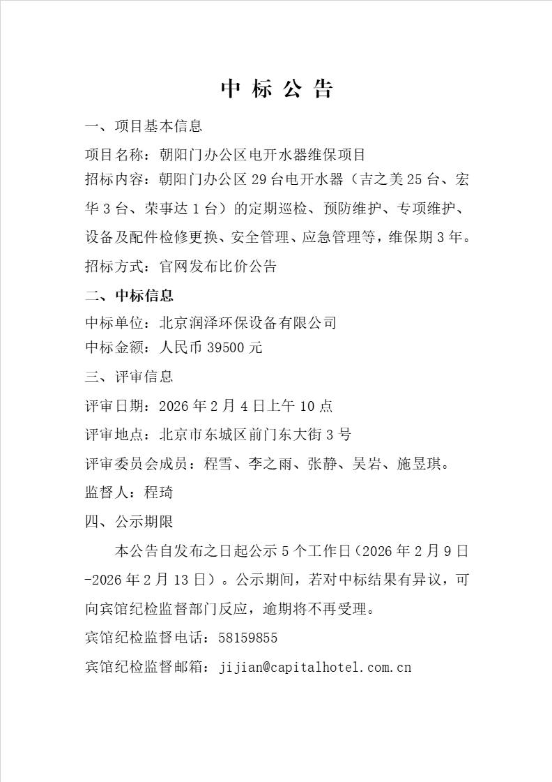 朝阳门办公区电开水器维保项目中标公告