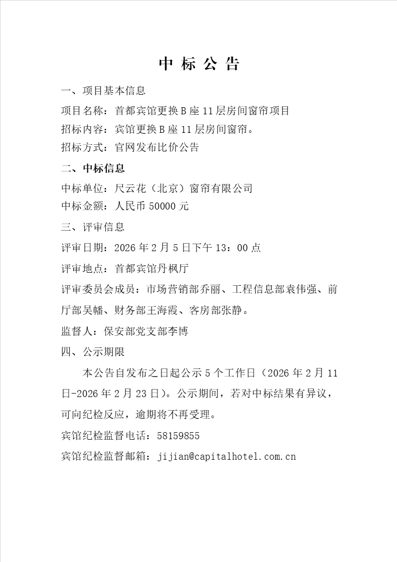 首都宾馆更换B座11层房间窗帘项目中标公告