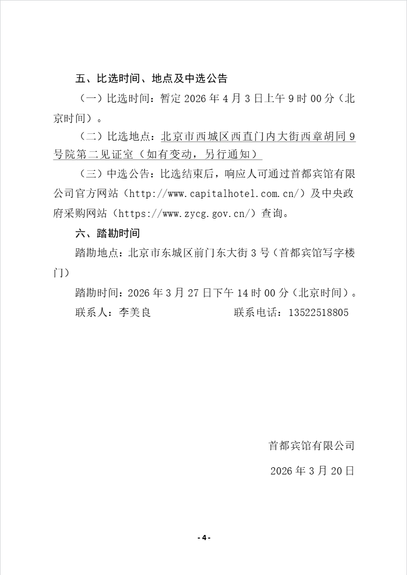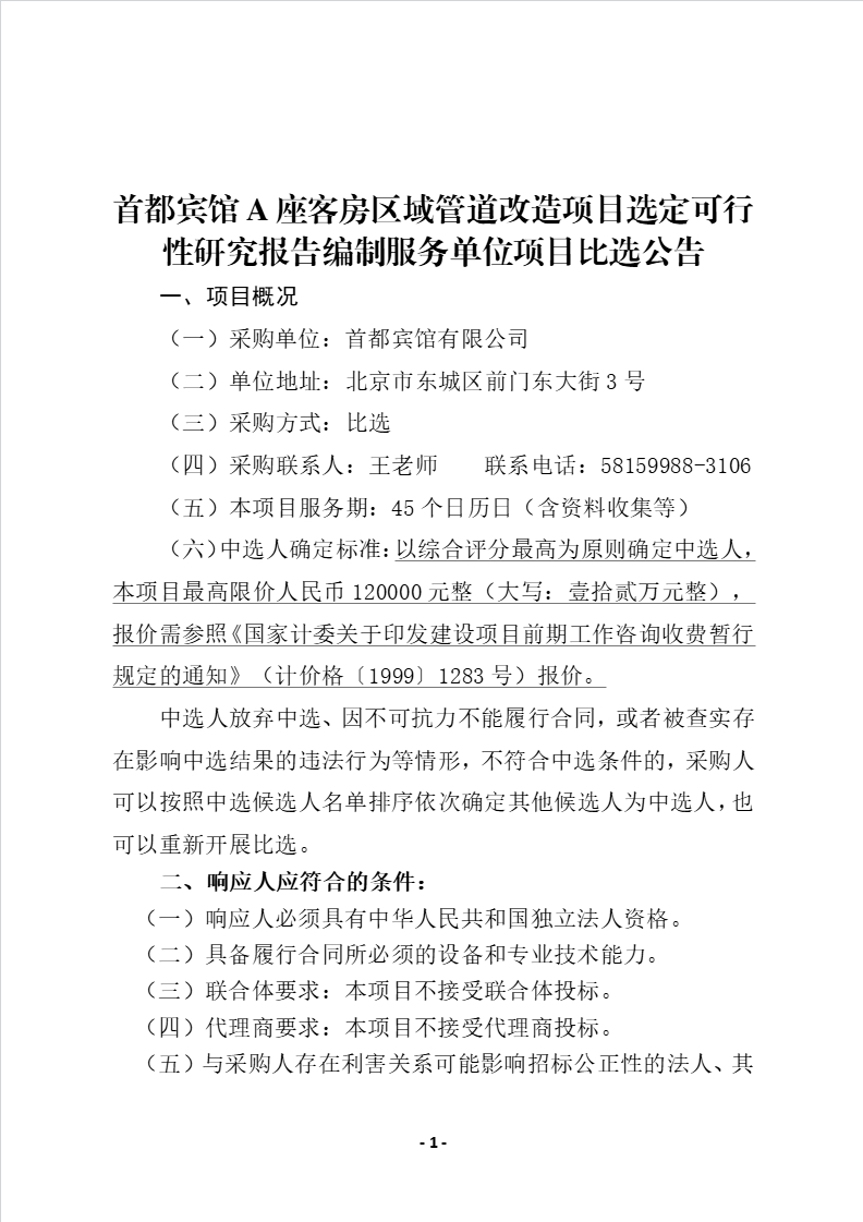 首都宾馆A座客房区域管道改造项目选定可行性研究报告编制服务单位项目比选公告